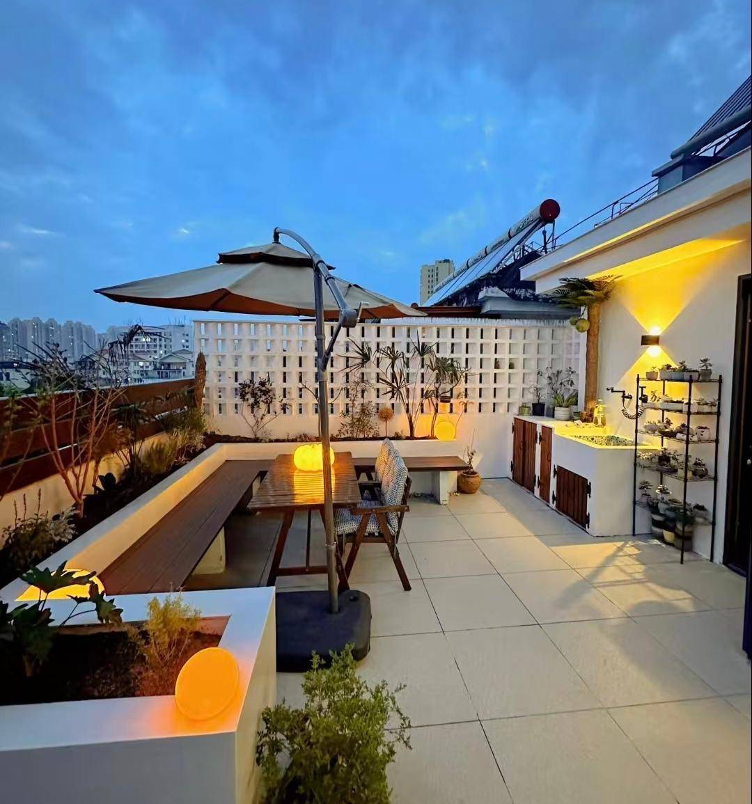 50㎡的露台做防水、做水电、贴砖、砌花池、装护栏、买绿植、各种好看的户外灯具和家具,整个下来6万块钱没有了,就这还是抠抠搜搜的,所有的东西都不敢买大品牌的。